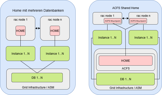 ACFS Shared Homes: Ein einziges Oracle Home wird über ACFS bereitgestellt und von mehreren RAC-Nodes gemeinsam genutzt.